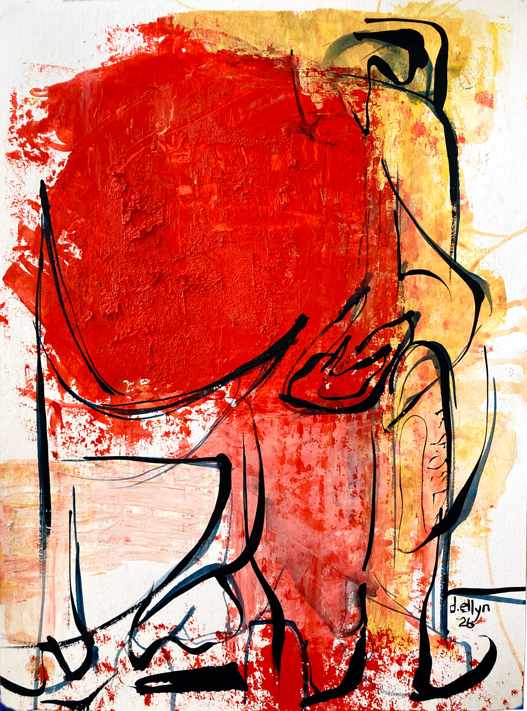 Red Cape is an abstract painting inspired by Dana Ellyn’s repeated trips to Barcelona for solo exhibitions at Galerie Artevistas - just off La Rambla. Reduced to a few decisive lines and a single red field, the composition draws from the visual language of the bullfight—horns, figure, and cape—translated into minimalist form.