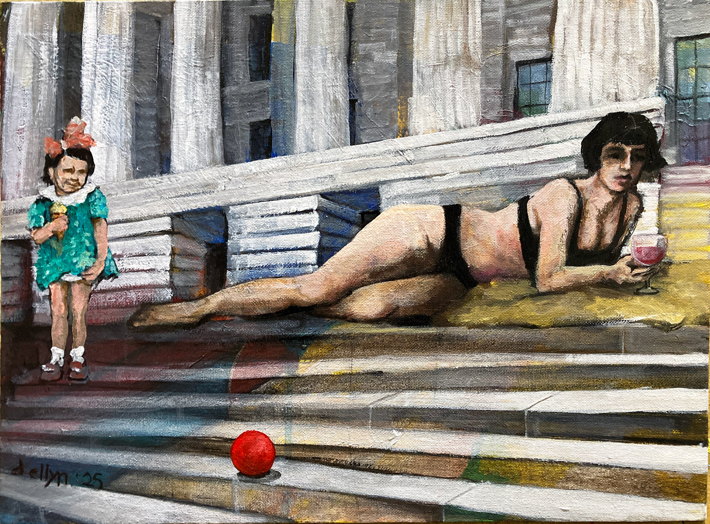Set against the marble steps of Washington, DC’s National Portrait Gallery, this painting stages a quiet collision of worlds. A reclining figure, absorbed in leisure, shares the space with a child who has wandered into view — ball rolling forward, ice cream dripping in hand.